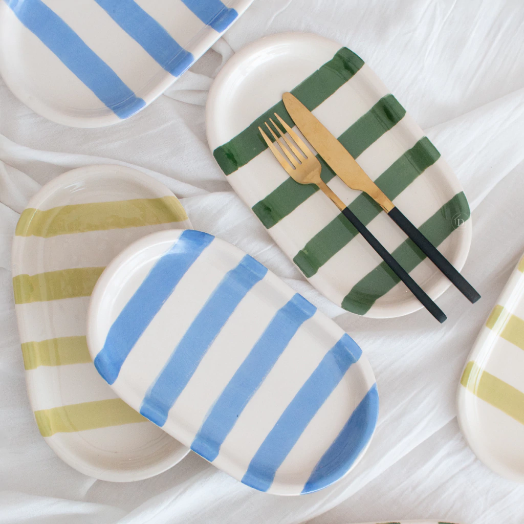 Colores: blanco con líneas pintadas a mano en azul, verde, verde manzana y negro (técnica wash)