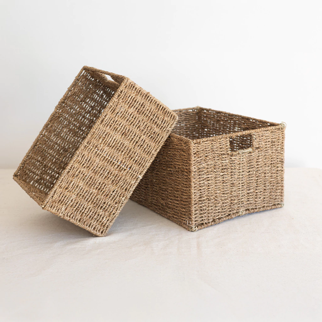 Los cestos Sabal combinan estructura firme con apariencia natural. Están tejidos a mano en seagrass, una fibra que suma textura sin perder funcionalidad. Gracias a su armazón metálico, mantienen la forma incluso con peso y se adaptan a cualquier rincón: desde estantes abiertos hasta muebles cerrados.