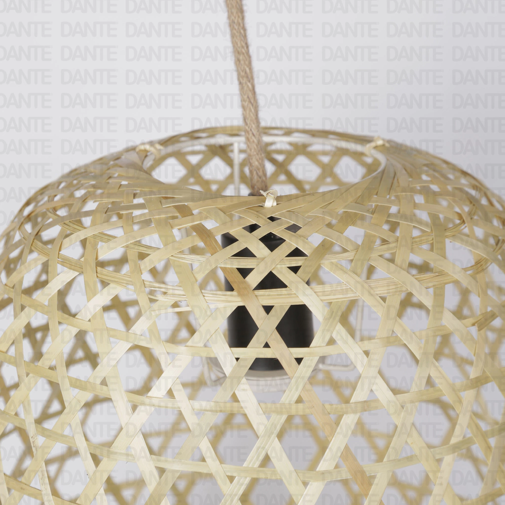 Su cuerpo de bambú tejido calado refleja la destreza artesanal, aportando un toque natural y una sensación de serenidad en cualquier ambiente. El cable de arpillera se combina con un florón y portalámpara metálico, disponible en negro o blanco según tu elección de diseño.