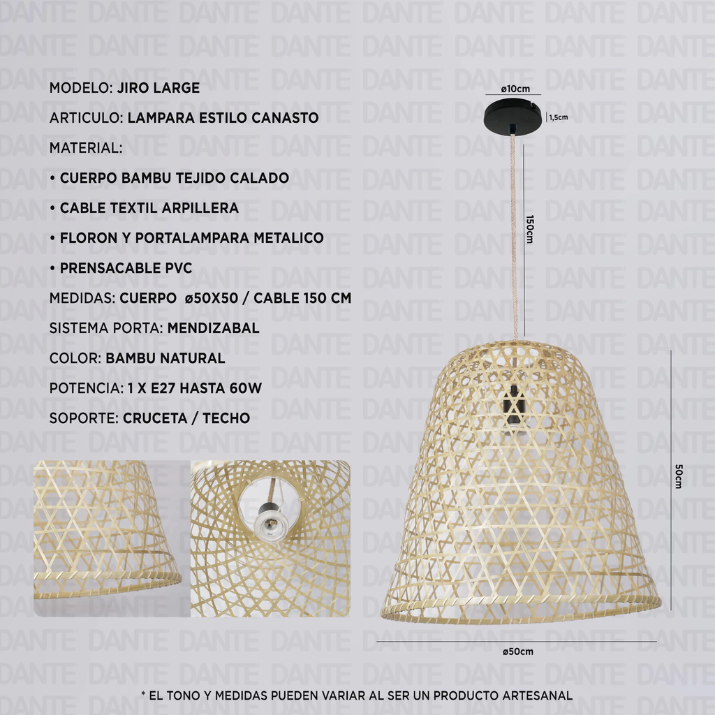 La lámpara JIRO LARGE combina diseño y funcionalidad, con capacidad para una bombilla E27 de hasta 60W LED. Agrega un toque de elegancia natural y una luz suave a tu espacio con esta exquisita lámpara colgante.