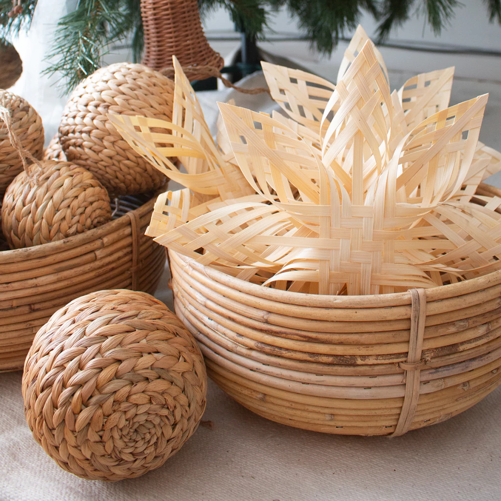 Un clásico de temporada con textura natural. Este copo de nieve de bambú está tejido y queda perfecto tanto en el árbol como en paredes, estantes o rincones navideños. Su diseño liviano permite usarlo incluso como punta de árbol para sumar un toque cálido y artesanal.