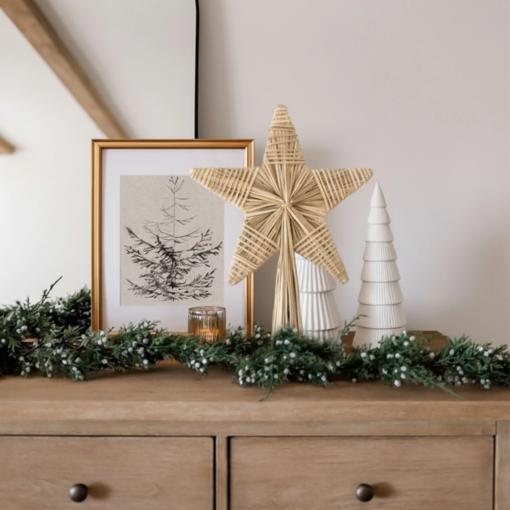 Una estrella con textura natural y diseño trenzado que queda perfecta como punta del árbol. Con ese toque cálido del seagrass, también funciona para decorar paredes, estantes o sumar a cualquier rincón navideño. Y un detalle muy imporante.. TIENE ARMAZÓN DE HIERRO! cuando la guardas para el próximo año queda intacta!