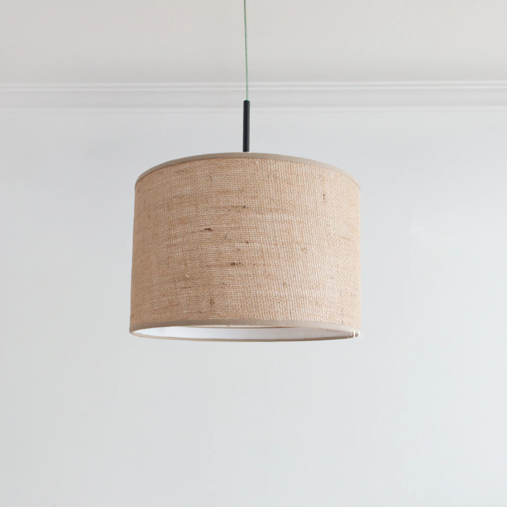 Su pantalla de arpillera aporta textura y calidez, mientras que el difusor inferior translúcido genera una luz uniforme y suave.