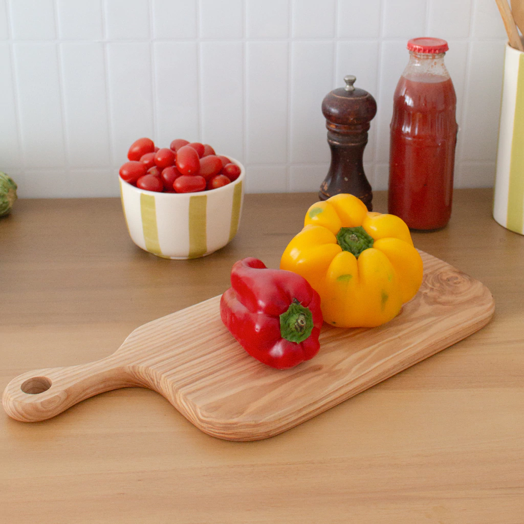 La tabla Luare está hecha en fresno macizo, una madera resistente y de veta marcada que aporta belleza natural a cualquier cocina. Su tamaño cómodo y su mango integrado permiten usarla tanto para cortar como para servir quesos, panes, picadas o preparaciones del día a día.